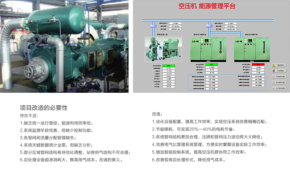 前景 壓縮空氣系統(tǒng)節(jié)能是壓縮空氣系統(tǒng)節(jié)能增效集成,根據(jù)流體力學(xué)原理,分析壓縮空氣系統(tǒng)輸配效率,并采用優(yōu)節(jié)能控制方法結(jié)合工業(yè)變頻、綜合余熱回收、測(cè)控,對(duì)壓縮空氣系統(tǒng)中的空壓機(jī)、處理設(shè)備、管網(wǎng)閥門(mén)、終端設(shè)備等單元進(jìn)行化控制,實(shí)現(xiàn)壓縮空氣系統(tǒng)整體節(jié)能增效。